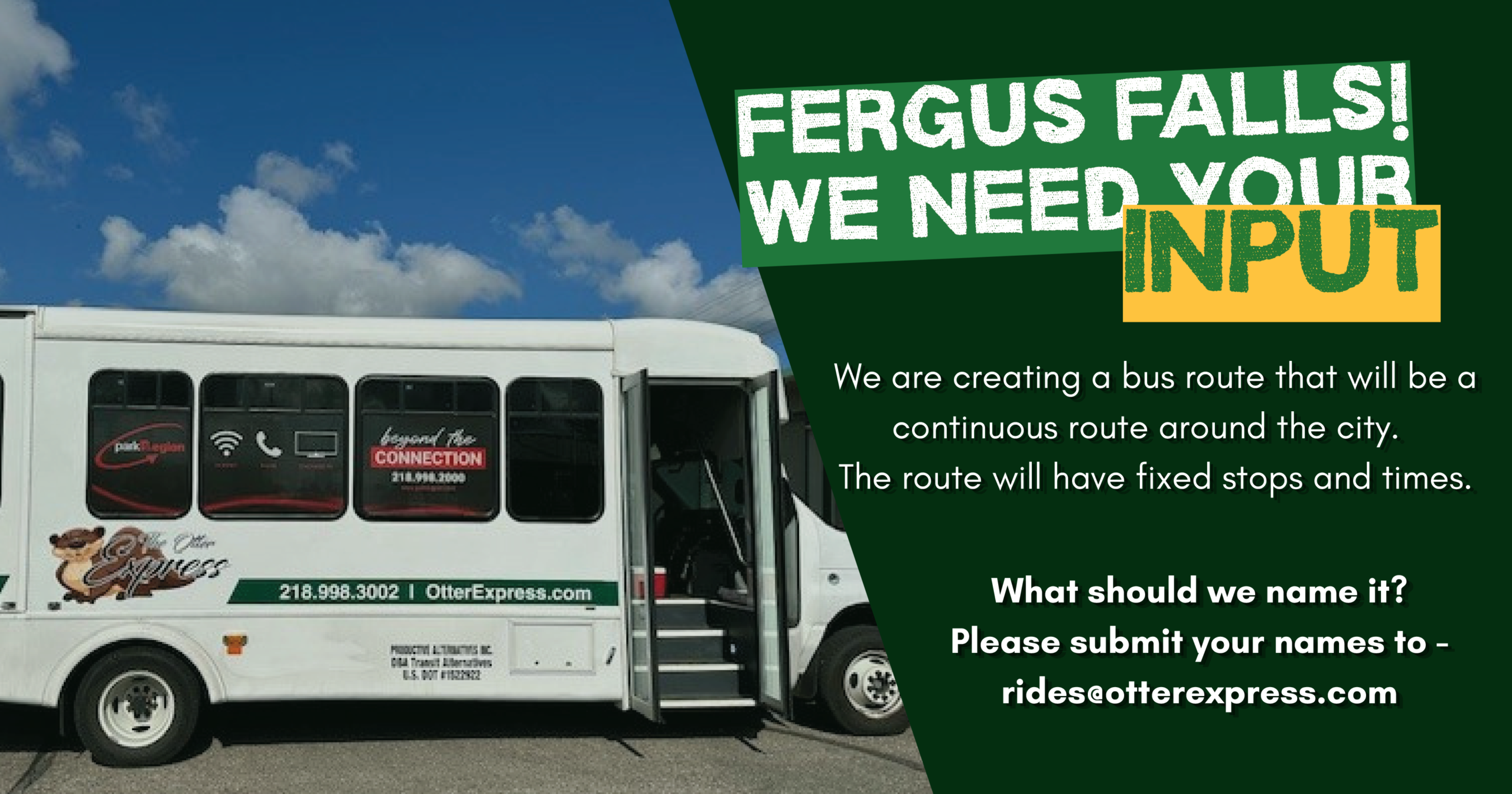 Transporting the general public for a fee. Otter Express provides transportation options for all residents within city limits of Fergus Falls, Perham, and Breckenridge.